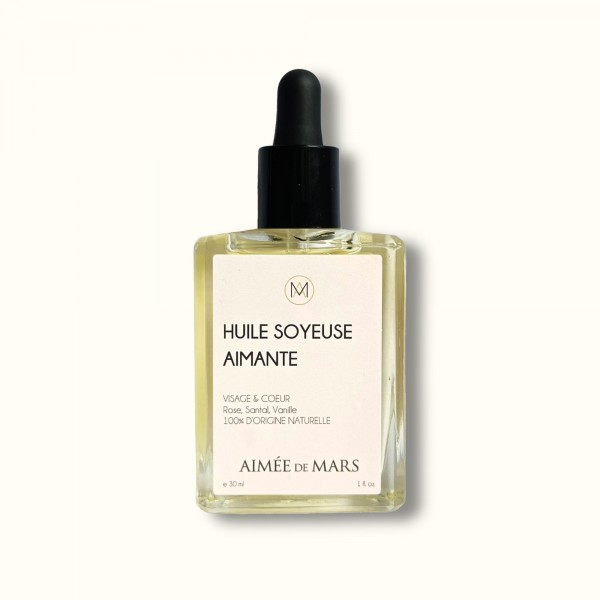 L’Huile Soyeuse Aimante s’inscrit au cœur de la collection Aromasoins d’AIMÉE de MARS, où olfactothérapie, toucher conscient et soin naturel se rencontrent pour rétablir l’harmonie du corps et des émotions. Véritable élixir précieux pour le visage, la poitrine et le plexus solaire, cette huile sèche allie la finesse des huiles végétales de Périlla régénérante, de Tournesol nourrissante et de Jojoba équilibrante à la puissance vibratoire des huiles essentielles naturelles de Vanille, Rose et Santal.