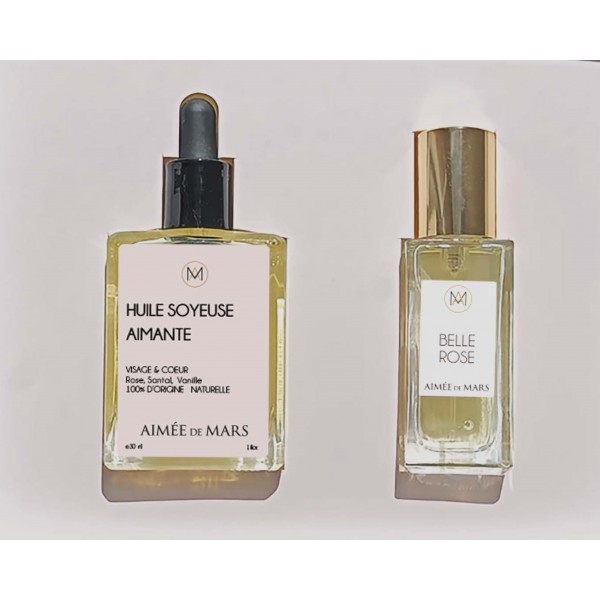 le Parfum naturel Belle Rose, en format voyage 15ml, et l’Huile soyeuse Aimante, soin holistique de 30ml.